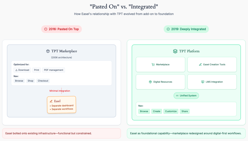 The infrastructure evolution: Easel’s initial success exposed the limitations of treating it as an add-on. The 2019 rebrand and marketplace redesign enabled Easel to become a core platform capability, not a bolt-on feature, requiring organizational transformation to match product success.
