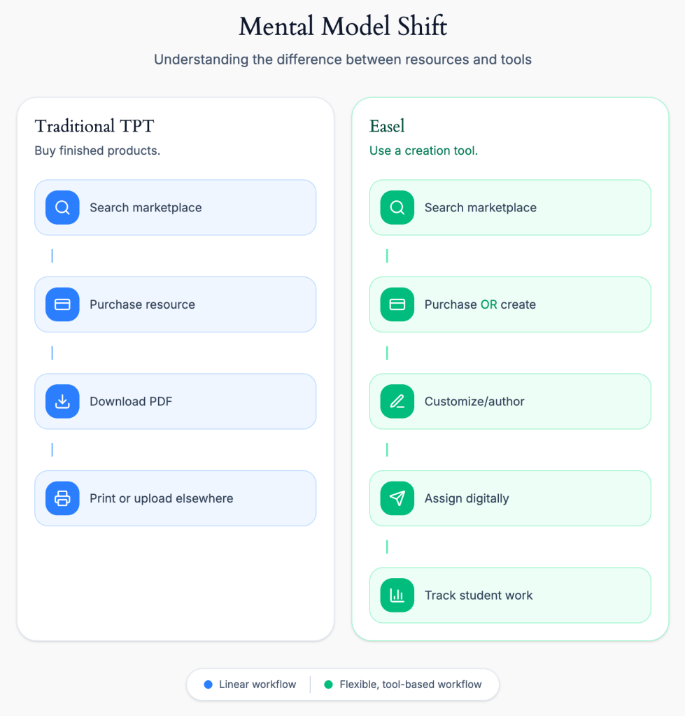 TPT was built to sell resources (PDFs, worksheets). Easel was a tool. This distinction shaped everything: