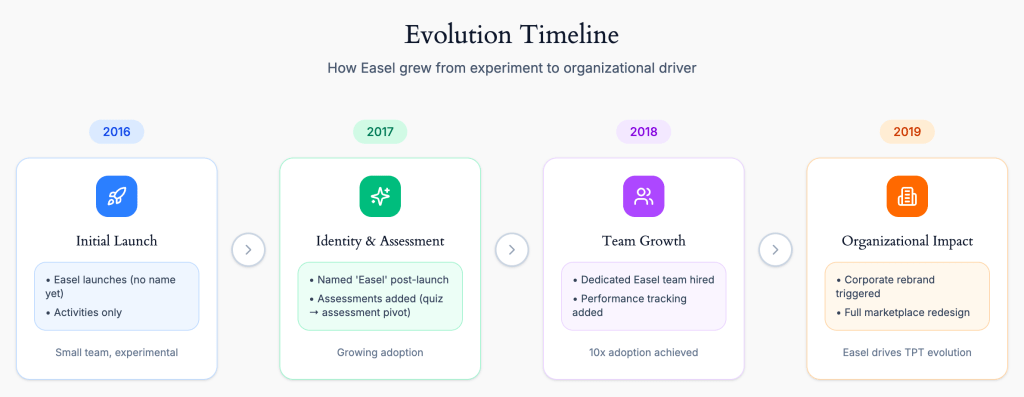 Easel’s trajectory from experimental feature to organizational catalyst. What began as an add-on tool eventually required TPT to reimagine its entire brand and marketplace—demonstrating how product success can drive company-wide transformation.