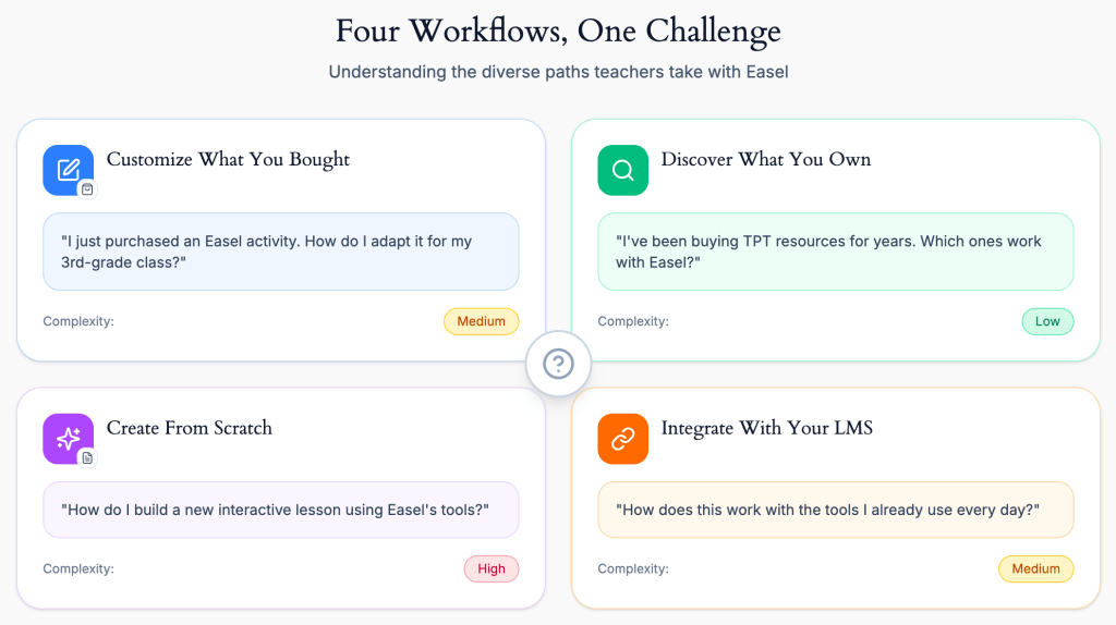 The three workflows (customize, discover, create) weren’t just features—they were fundamentally different mental models. Onboarding wasn’t about “teaching the product”; it was about helping teachers understand which workflow applied to their situation.