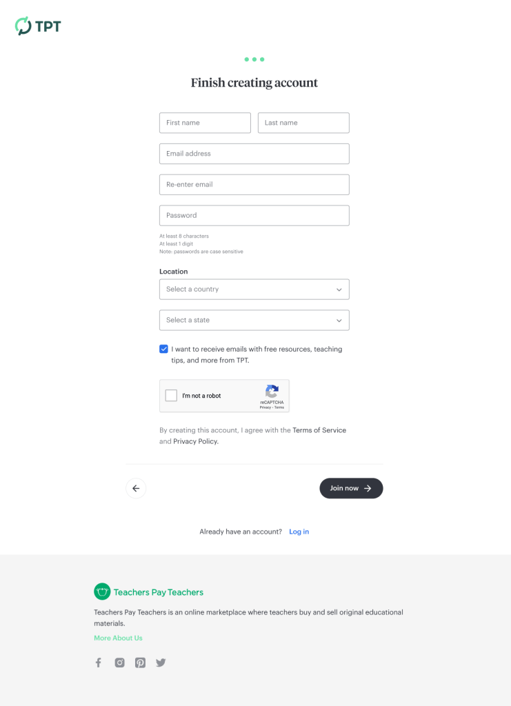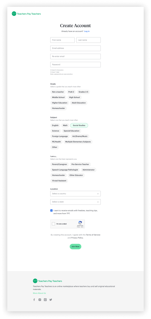 The login and registration flow at Teachers Pay Teachers had become a liability. Visually outdated and misaligned with our new brand, it undermined trust at a critical moment. Functionally, it was a missed opportunity: we were onboarding thousands of new teachers without gaining sufficient insight into them to personalize their experience or inform internal strategy. Built on legacy code with significant technical debt, it had been deprioritized from the roadmap, landing in backlog purgatory despite being the first impression for new users following increased marketing investment.